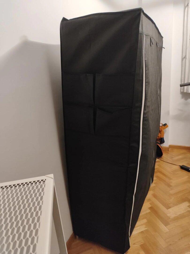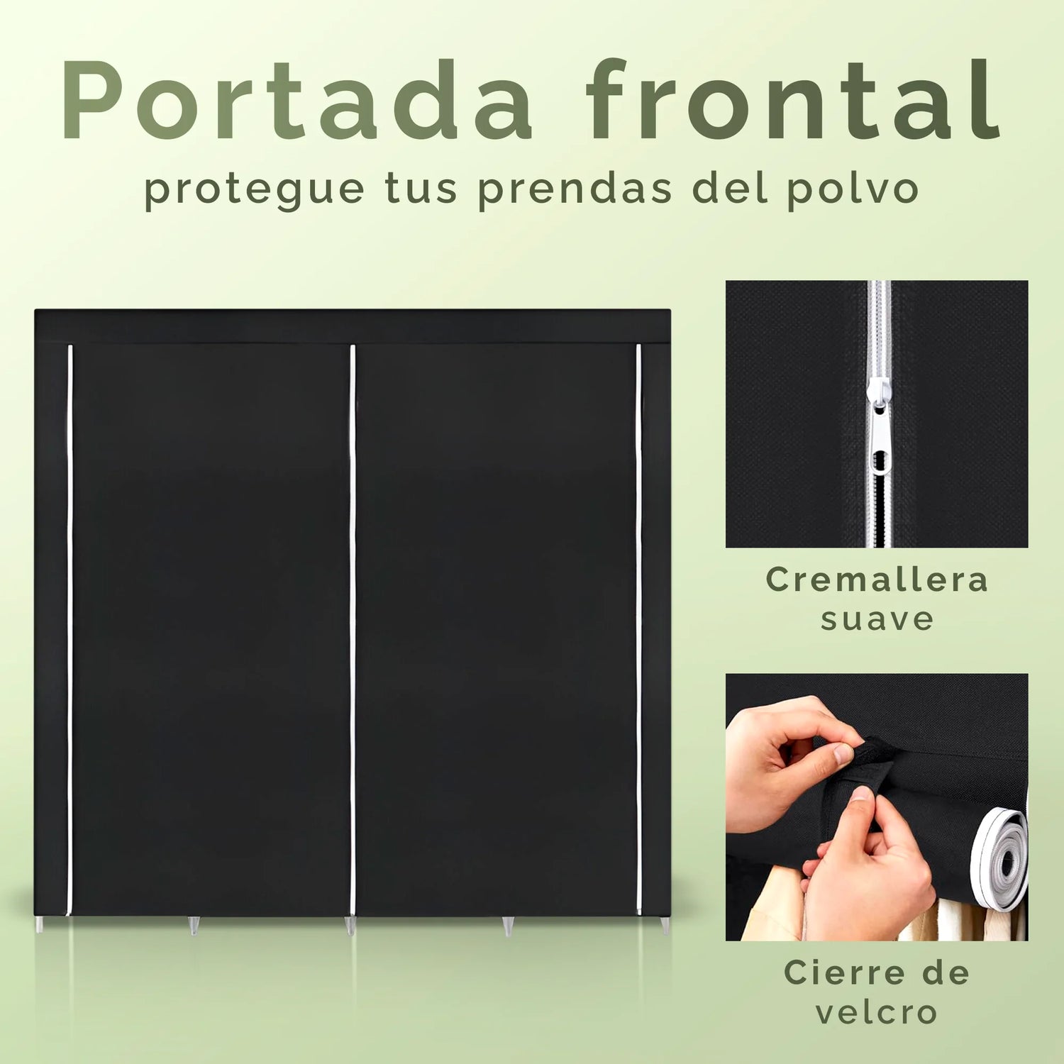 la cubierta exterior está hecha de tela no tejida de alta calidad, gruesa y duradera, a prueba de polvo y resistente al agua. Las puertas enrolladas con cremallera garantizan que tu ropa permanezca limpia y ordenada.